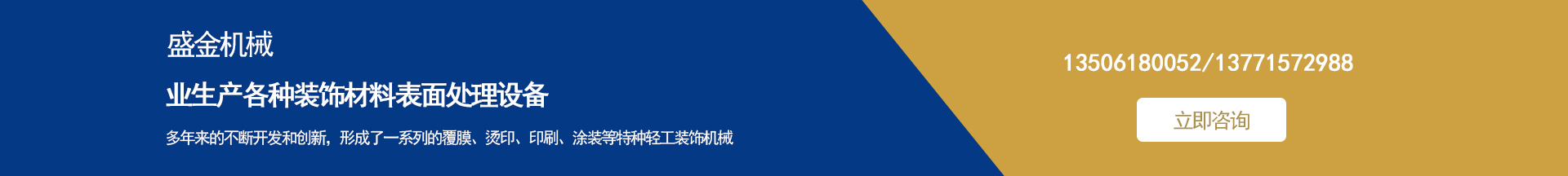 盛金機(jī)械專業(yè)生產(chǎn)各種裝飾材料表面處理設(shè)備 集多年來的不斷開發(fā)和創(chuàng)新,形成了一系列的覆膜、燙印、印刷、涂裝等特種輕工裝飾機(jī)械。并敢于和善于開發(fā)用戶急需的特殊要求機(jī)械設(shè)備。